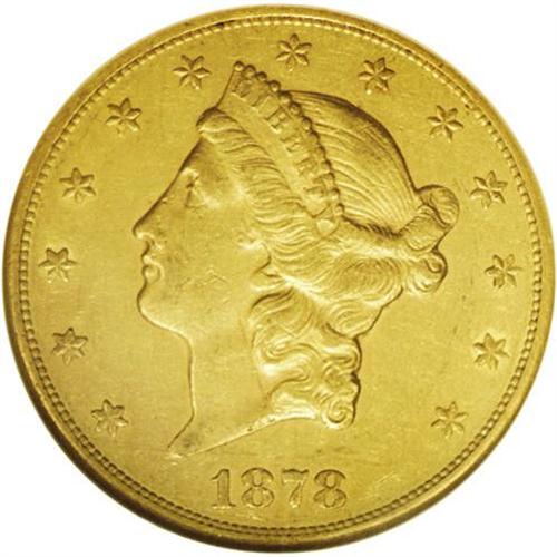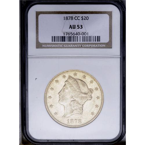 <B>1878-CC<$20> AU53 NGC.</B></I> Variety 1-A. The dies utilized on the scarcer Carson City twenty, one of just 13,180 pieces struck, are readily identified by the diagnostic raised vertical die line on Liberty's neck and two small die lumps between TY in TWENTY. This mildly prooflike example is far less abraded than normally seen and exhibits delicate orange accents.<BR><I>From The Steve Glenn Collection.</B></I> <BR><BR><B>Important notice:</B> Heritage usually auctions material at the rate of 200-250 lots per hour. On some occasions eBay Live bid software or the Internet may not be able to keep up with the pace of the auction. We recommend placing a realistic absentee bid now as insurance to avoid disappointment. Occasionally the auctioneer may eliminate or reject an eBay Live bid, and the auctioneer may also reopen a lot after the close of the eBay live bidding (usually because we missed an audience bid), and may reject your bid even if it shows you as the winning bidder. By bidding via eBay Live, you agree that Heritage may award the lot to another bidder at its sole discretion under the circumstances described above or any other reasonable circumstances. Since eBay bids are not shown to us until we open the lot on the floor, we treat those bids just like floor bids. In most cases the floor responds before the eBay bid is presented to us, due to Internet lag time, so for consistency we have made it a policy that floor bids are always considered first over tie eBay live bids. Also please note that all Heritage lots purchased through eBay Live carry a 20% Buyer's Premium. Please make sure you read the Terms and Conditions before you bid. This lot is being auctioned in conjunction with a live floor auction by Heritage Galleries & Auctioneers. All final auction and invoice information will be supplied by Heritage Galleries & Auctioneers, and all other information should be considered preliminary. Lot:4275 <BR><BR><B>Winning Notification and Billing:</B> After the FINAL session in this auction is complete, Heritage will send e-mail and snail mail invoices. This process normally takes several days. All final auction and invoice information will be supplied by Heritage Galleries & Auctioneers, and all other information should be considered preliminary. <BR><BR>This auction will be conducted on a live auction floor and over the Internet through eBay Live. If you choose to place an absentee bid, please take a moment to <font color='#0000ff'><u><a href='http://pages.ebay.com/liveauctions/help/before/laabsentee.html'>learn how eBay Live absentee bidding works</a></u></font><font color='#000000'>