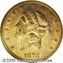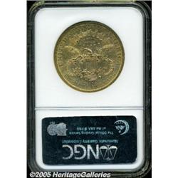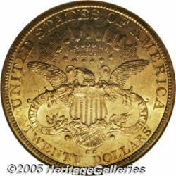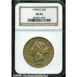 <B>1878-CC $20 AU55 NGC.</B></I> Pale yellow color with splashes of darker toning. The surfaces are lightly abraded and the fields exhibit traces of reflective mirrored luster. Both obverse and reverse have mint-made die scratches that are seen on virtually every known example of this issue.