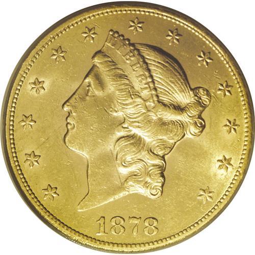 <B>1878-CC $20 AU58 PCGS.</B></I> Variety 1-A. The 1878-CC twenty is a scarce, low mintage issue that enjoys perpetual demand from advanced gold collectors and Carson City specialists alike. Perhaps fewer than a dozen Uncirculated pieces survive, lending added importance to those that approach Mint State quality. This bright, shimmering representative is modestly abraded for the grade and mintmark, and shows only the slightest interruption of luster on the highpoints of the obverse. Desirable quality for this sought-after CC twenty. Population: 8 in 58, 7 finer (11/06).<BR><BR><b>Shipping:</b> Coin/Currency (<a target="_blank" href="http://www.heritageauctions.com/common/shipping.php">view shipping information</a>)