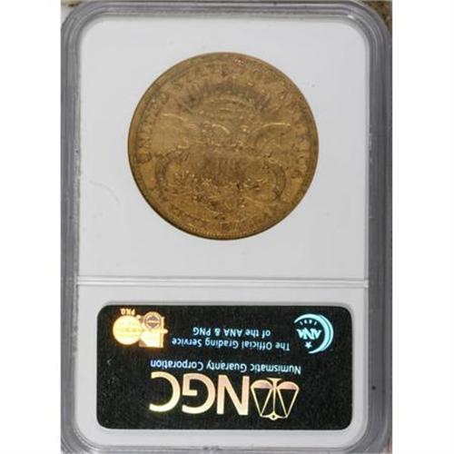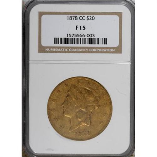 <B>1878-CC $20 Fine 15 NGC.</B></I> An orange-gold representative that exhibits moderate to significant wear on the devices. Surprisingly, the die gouge on Liberty's neck remains clear. Small, scattered copper stains appear at the margins of this minimally abraded piece.<BR><BR><B>Coin Engraver:</B> James B. Longacre<BR><BR><b>Shipping:</b> Coins & Currency (<a target="_blank" href="http://www.heritageauctions.com/common/shipping.php">view shipping information</a>\)