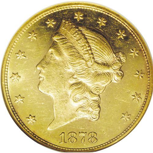 <B>1878-CC<$20> MS60 Prooflike NGC.</B></I> Variety 3-A. While Douglas Winter, in his book <I>Gold Coins of the Carson City Mint,</B></I> identifies two varieties (1-A and 2-B), the present coin displays the A reverse but a different obverse from the two designated varieties. The obverse does not show a lengthy vertical die scratch on the back of Liberty's neck near her hair (as does variety 1-A), but the reverse shows several bold die lines through the letters in DOLLARS, and another that nearly touches the second T in TWENTY (as per variety 1-A).<BR> The 1878-CC is rare in Mint State, with only 13 examples certified by NGC and PCGS to date (5/06). In Prooflike, NGC has certified only the present coin! This MS60 specimen displays sharply struck design elements that stand out against partially mirrored fields. Both sides are bathed in pretty apricot-gold color, and reveal an even distribution of light contact marks.