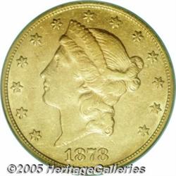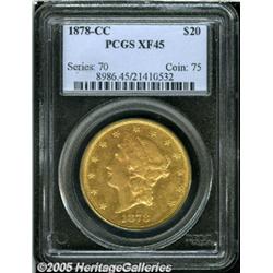 <B>1878-CC $20 XF45 PCGS.</B></I> This is an extremely important opportunity for the advanced die variety specialist. Michael Fuljenz and Doug Winter described certain characteristic die scratches on the obverse and reverse of nearly every known example. They stated: "The authors are aware of only one 1878-CC Double Eagle which does not show the mint-made die scratches on the obverse and the reverse ... It is probably that some others exist." <B>This example does not show these usual die scratches.</B></I> It has honey-gold color on the obverse with lighter yellow devices. The reverse has a greenish coloration, and it has a light scratch from the U of UNITED across the eagle's head.