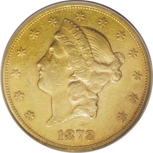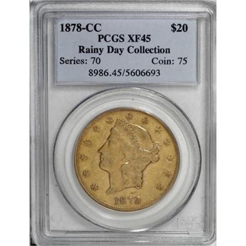 <B>1878-CC $20 XF45 PCGS.</B></I> Ex: Rainy Day Collection. Garrett and Guth comment that the 1878-CC double eagle is among the rarer Nevada issues and they point out that production of Carson City twenties dropped off sharply this year. But why? There are three principal reasons. First, 1878 was the year of the Bland-Allison Act, and it meant that the mints turned much of their attention to churning out silver dollars, as a virtual flood of silver ore came from the Comstock Lode. Second, the production of gold in the American West was dwindling as the yellow ore became more difficult to mine profitably. Third, the “bimetallism battle” caused by Bland-Allison forced gold coins out of circulation in most parts of the country: the profit motive made the hoarding of gold tempting for anyone who understood the arbitrage opportunities. Gold circulated mainly in the West, where hard money had always been more appealing than paper. Much of the allure of a slightly circulated coin such as this is to imagine what it witnessed. Was it spent for pony supplies at Fort Carson? Did it change hands on the poker tables of Dodge City? If only it could tell us! The surfaces show even wear over each side. Minimally abraded, the coin has lovely rose tinted gold color with an accent of lilac over the highpoints. <BR><BR><b>Shipping:</b> Coins & Currency (<a target="_blank" href="http://www.heritageauctions.com/common/shipping.php">view shipping information</a>)
