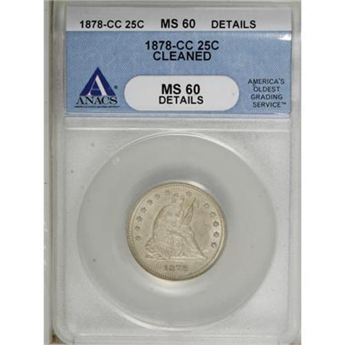 <B>1878-CC 25C --Cleaned--ANACS. MS60 Details.</B></I> NGC Census: (2/150). PCGS Population (4/139). Mintage: 996,000. Numismedia Wsl. Price for NGC/PCGS coin in MS60: $350. (#5509)<BR><BR><B>Coin Engraver:</B> Christian Gobrecht<BR><BR><b>Shipping:</b> Coins & Currency (<a target="_blank" href="http://www.heritageauctions.com/common/shipping.php">view shipping information</a>)