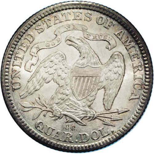<B>1878-CC<25C> MS63 NGC.</B></I> Like the other mints, coinage production in 1878 consisted primarily of the new "Bland Dollars," although other denominations were produced, mostly in limited quantities. The Carson City Mint coined 996,000 quarters in 1878, the second highest mintage denomination. Struck from the so-called "canceled dies" that show a long die scratch from the right knee cap up into the left arm of Liberty. The design features are well brought up, and the lustrous surfaces display a delicate layer of ice-blue, lavender, and golden-brown patina. A few minor handling marks in the fields define the grade. A highly desirable example, and an important opportunity for the advanced Seated Liberty collector.