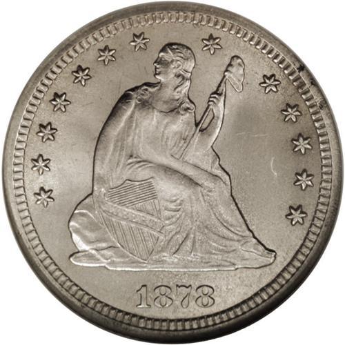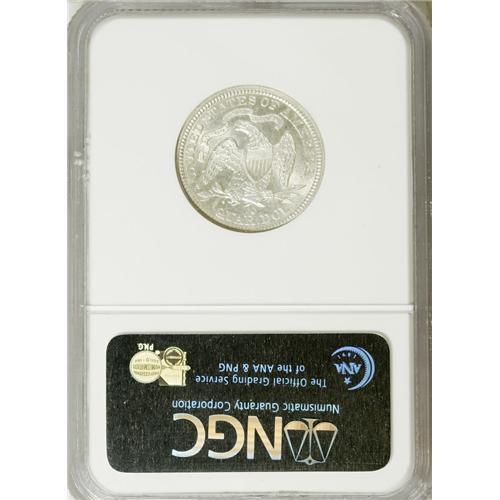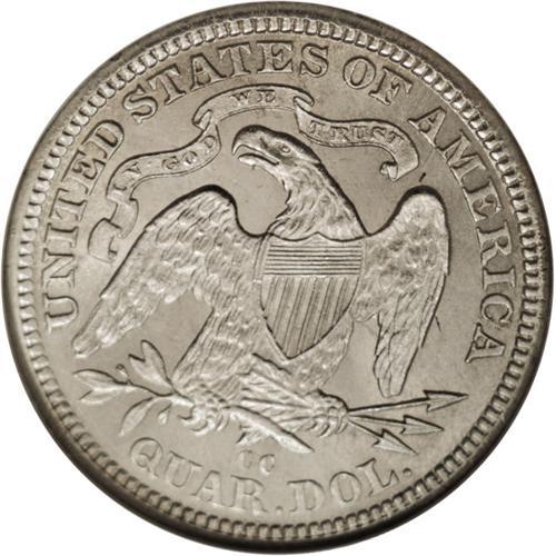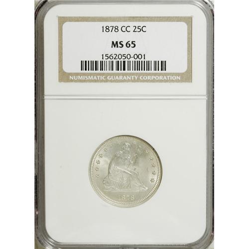 <B>1878-CC 25C MS65 NGC.</B></I> This coin appears to be from a reverse die that is unlisted in Briggs' 1991 <I>Comprehensive Encyclopedia of Seated Liberty Quarters.</B></I> Both C's in the mintmark lean markedly backward. The first C is noticeably fainter and markedly higher than the second C. The obverse shows a few lumps of die rust on Liberty's legs, mostly near the knees. This coin is radiant, well struck, and stone-white. A tiny die crack joins two of the eagle's feathers directly to the left of the shield, about at its midpoint. An interesting coin for the Seated quarter specialists.<BR><BR><b>Shipping:</b> Coins & Currency (<a target="_blank" href="http://www.heritageauctions.com/common/shipping.php">view shipping information</a>)