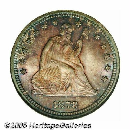 <B>1878-CC<25C> MS66 NGC.</B></I> Final year of Quarter production at the Carson City Mint and one of the more obtainable issues of the type from the Nevada facility. Although lesser grades Uncirculated pieces show up with some frequency, Gem and finer 1878-CC Quarters are of the utmost scarcity. This satiny, richly toned example incorporates shades of carmine, russet, and cobalt-blue, but these dramatic colors do not adversely affect the underlying luster. Population: 5 in 66, 1 finer (4/05).
