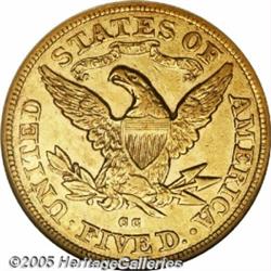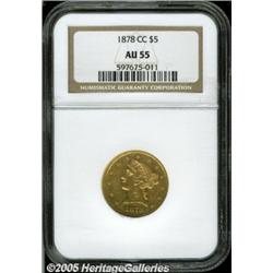 <B>1878-CC $5 AU55 NGC.</B></I> The mintage for the 1878-CC Half Eagle is only 9,054 pieces, but this only begins to explain its rarity in high grades. Gold coins circulated extensively in the west, where paper money was regarded as suspect. Although a handful of eastern and Midwestern numismatists collected gold coins by date, this was generally limited to the Philadelphia mint proofs. Even silver coins were not widely collected by mintmark until nearly a generation later. Thus, the survival of a Choice Almost Uncirculated 1878-CC is merely a matter of chance. In fact, NGC has only certified one piece in Mint State.<BR> A crisply struck example, the eagle's neck and fletchings are not completely brought up, but offer pleasing detail nonetheless. There are no contact marks that distract from the eye appeal of the partially remaining semi-prooflike luster. The present Condition Census quality example is worthy of the best specialized holding of Carson City gold coins. Population: 2 in 55, 5 finer (2/05). Also, PCGS has certified only three examples as AU55 with two finer.