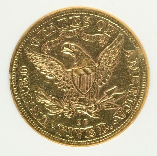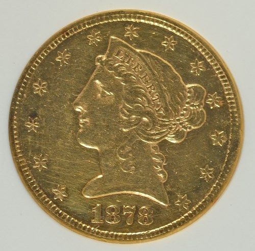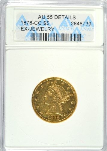 1878-CC $5 GOLD LIBERTY ANACS AU55 EX-JEWELRY, RARE "CC" $5 LIBERTY, COIN WAS