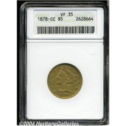 <B>1878-CC<$5> VF35 ANACS.</B></I> Variety 1-A. Based on the multiple offerings in our last few signature sales, one might come to the conclusion that the 1878-CC Five Dollar is not as scarce as its mintage of 9,054 pieces would suggest. In actuality, nothing could be further from the truth. This mid-grade example is relatively unabraded and accented in milky olive and orange patina. <BR><BR><B>Important notice:</B> Heritage usually auctions material at the rate of 200-250 lots per hour. On some occasions eBay Live bid software or the Internet may not be able to keep up with the pace of the auction. We recommend placing a realistic absentee bid now as insurance to avoid disappointment. Occasionally the auctioneer may eliminate or reject an eBay Live bid, and the auctioneer may also reopen a lot after the close of the eBay live bidding (usually because we missed an audience bid), and may reject your bid even if it shows you as the winning bidder. By bidding via eBay Live, you agree that Heritage may award the lot to another bidder at its sole discretion under the circumstances described above or any other reasonable circumstances. Since eBay bids are not shown to us until we open the lot on the floor, we treat those bids just like floor bids. In most cases the floor responds before the eBay bid is presented to us, due to Internet lag time, so for consistency we have made it a policy that floor bids are always considered first over tie eBay live bids. Also please note that all Heritage lots purchased through eBay Live carry a 20% Buyer's Premium. Please make sure you read the Terms and Conditions before you bid. </span></font></tr></table></td></tr></table>