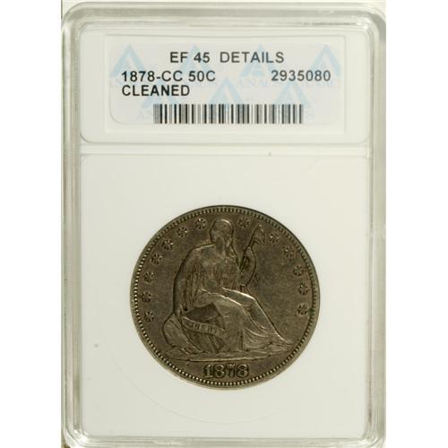 <B>1878-CC 50C --Cleaned--ANACS. XF45 Details.</B></I> This issue is rare because of the nation's focus on producing the inaugural Morgan dollars, as mandated by the Bland-Allison Act of 1878. Only 62,000 pieces of this half dollar were minted in Carson City, and series specialists avidly seek survivors. The present example shows bold definition along with the expected light wear. Moderate abrasions pepper the surfaces, and hairlines appear under a loupe from cleaning.<BR><I>From The Edward Sacks Collection.</B></I><BR><BR><b>Shipping:</b> Coins & Currency (<a target="_blank" href="http://www.heritageauctions.com/common/shipping.php">view shipping information</a>)