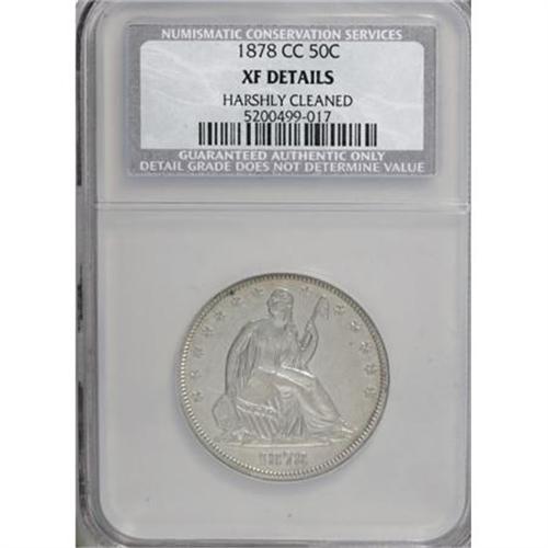 <B>1878-CC 50C --Harshly Cleaned--NCS. XF Details.</B></I> The pale silver-gray surfaces show extensive hairlines and an unnatural gloss from a past cleaning. The overall detail is pleasing for the issue, though, with only light, even wear across the central devices.<BR><I>From The Yoder Family Collection, Part One.</B></I><BR><BR><B>Coin Engraver:</B> Christian Gobrecht<BR><BR><b>Shipping:</b> Coins & Currency (<a target="_blank" href="http://www.heritageauctions.com/common/shipping.php">view shipping information</a>)