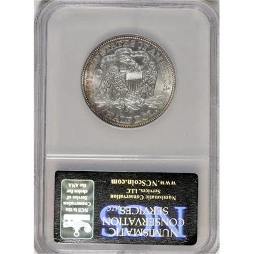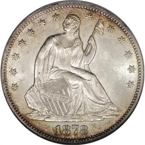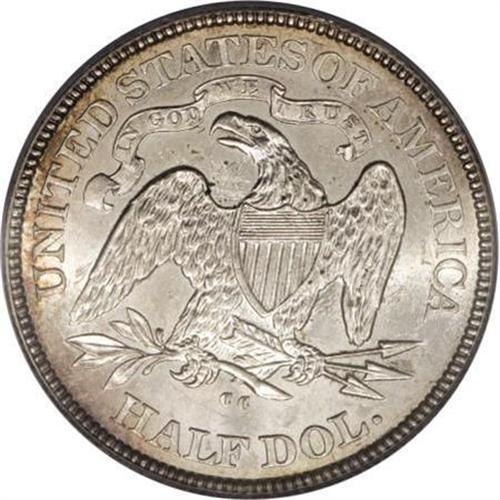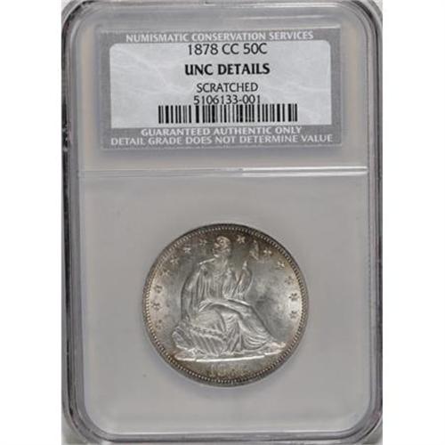 <B>1878-CC 50C --Scratched--NCS. Unc. Details.</B></I> At first glance, this is a lovely Mint State example with full cartwheel luster, a penetrating strike, and attractive peripheral golden-brown toning. A few clusters of pinscratches are noted on the field near the eagle, from an attempt to remove a few green flecks. The obverse displays faint hairlines on the right obverse field. A rare Carson City issue, since its production was interrupted to resume silver dollar coinage.<I><BR>From The Beau Clerc Collection.</B></I><BR><BR><B>Coin Engraver:</B> Christian Gobrecht<BR><BR><b>Shipping:</b> Coins & Currency (<a target="_blank" href="http://www.heritageauctions.com/common/shipping.php">view shipping information</a>)