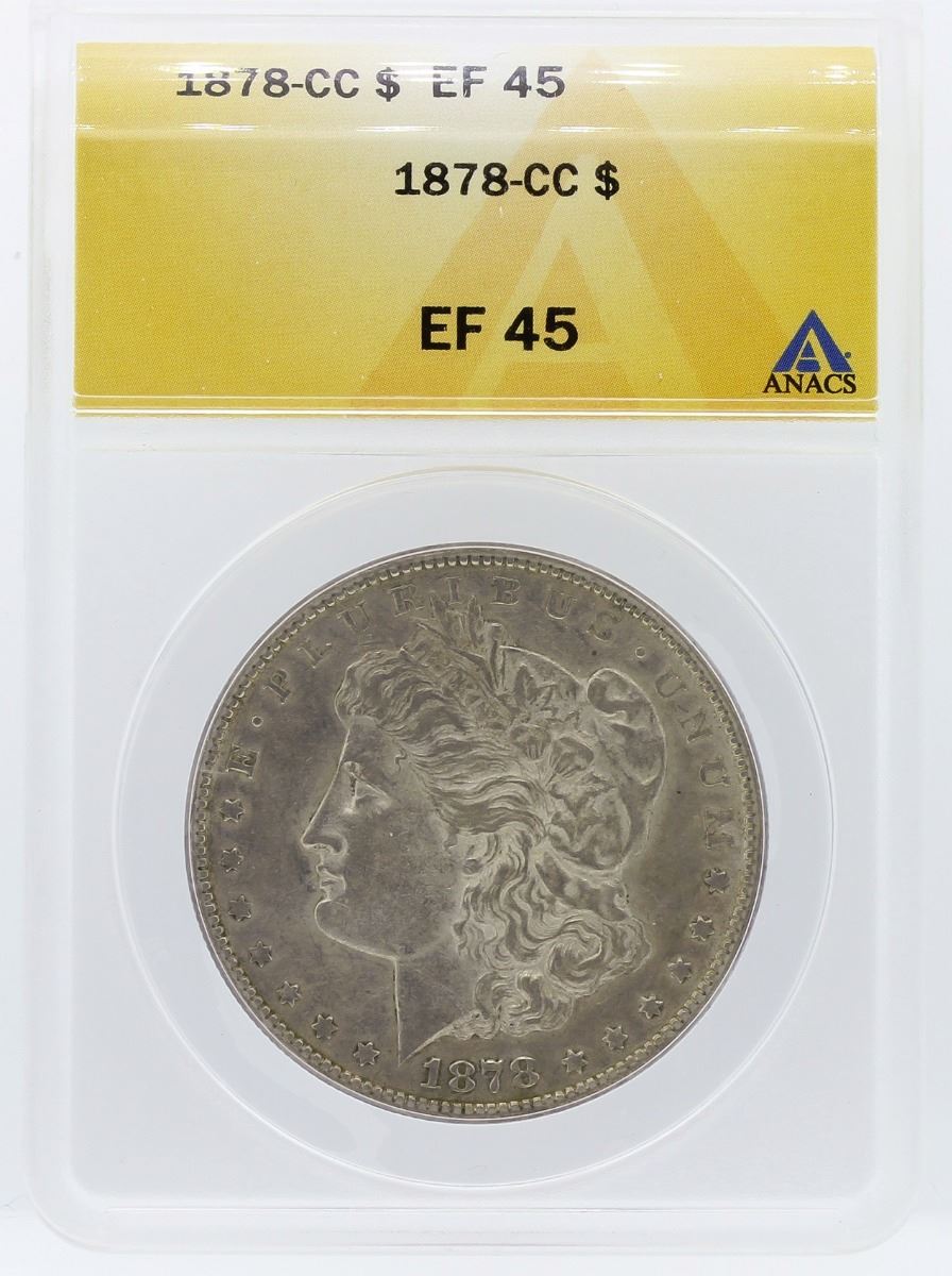 One 1878-CC ANACS EF45 Morgan Silver Dollar.