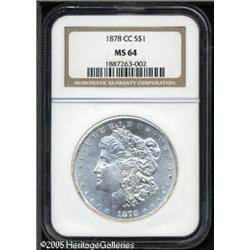 <B>1878-CC<img border='0' src='http://www.heritagecoins.com/images/star.gif' width=10 height=10>$1 MS64 NGC.</B></I> Sharply struck, with bright lustrous surfaces. Lot:9898