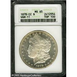 <B>1878-CC<img border='0' src='http://www.heritagecoins.com/images/star.gif' width=10 height=10>$1 MS65 ANACS.</B></I> VAM-11. A Top 100 Variety. Die lines (as made) are prominent within the eagle's wings. A semi-prooflike example that has a few wisps of golden-brown patina along the margins. Meticulously struck and attractive. Lot:9902