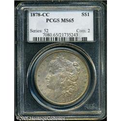 <B>1878-CC<img border='0' src='http://www.heritagecoins.com/images/star.gif' width=10 height=10>$1 MS65 PCGS.</B></I> Variegated golden-brown, mauve, and olive colors enrich this meticulously struck Silver Dollar. A few small marks on the cheek are concealed by the original patina. Lot:9903
