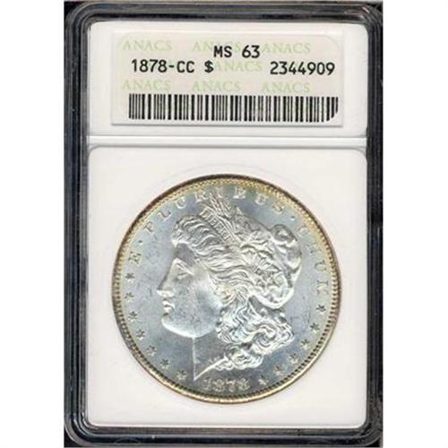 <b>1878-CC Morgan Dollar. ANACS graded MS63.</b> An attractive, very frosty white specimen of this first year of issue for the Morgan silver dollar. Desirable CC mintmark <b>(PCGS # 7080)</b>