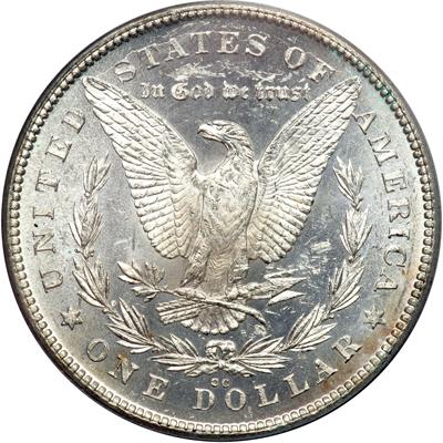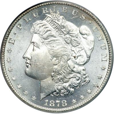 1878-CC Morgan Dollar. PCGS graded MS-64. Nice frosty coin with semi-reflective fields. Since most of these tend to be from frost-laden dies, semi-prooflike specimens stand out from the crowd (PCGS # 7080).