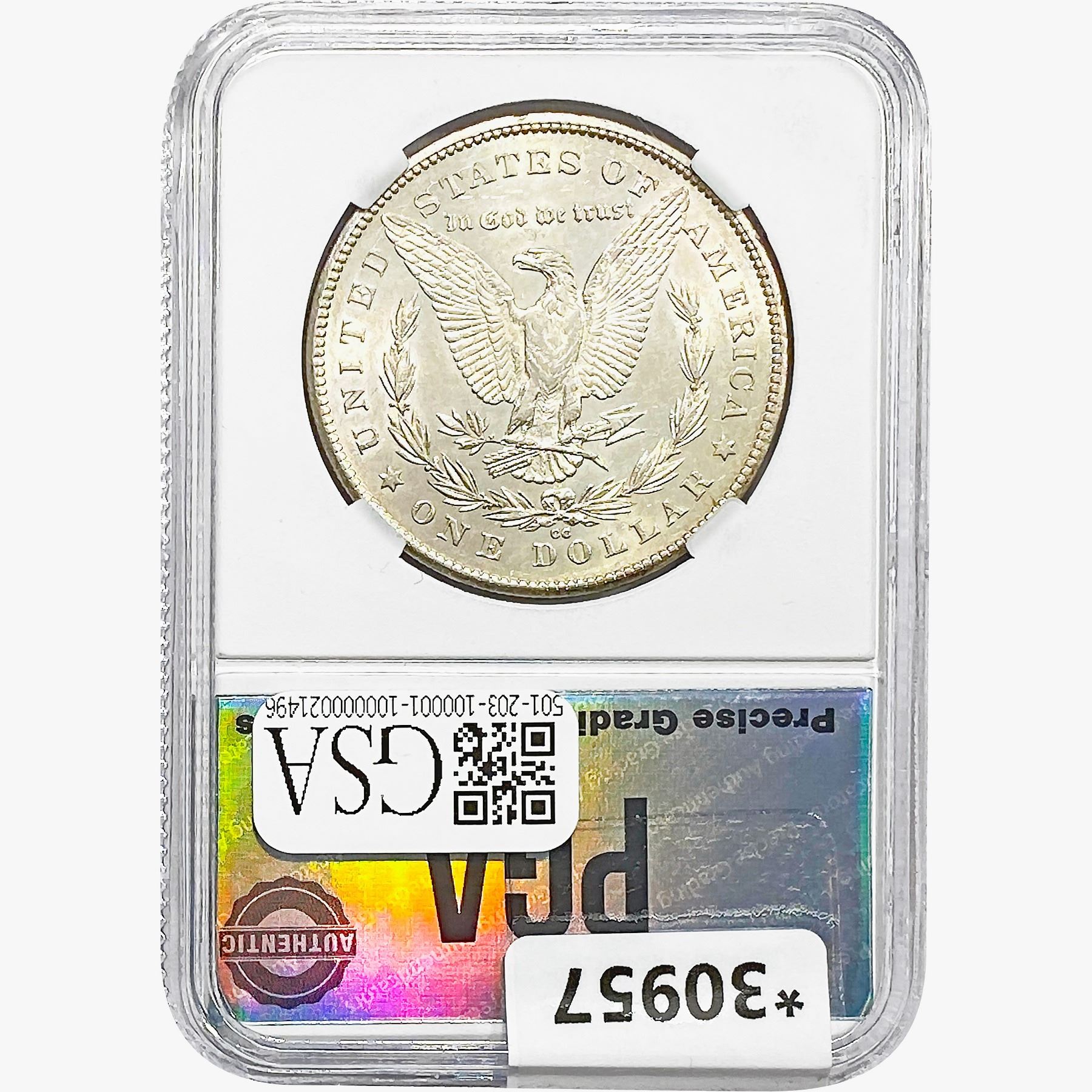 COINS AND CURRENCY LISTED IN GSA’S CATALOG AS GRADED AND ENCAPSULATED BY PCGS, NGC, ANACS, ICG, PCGS CURRENCY, PMG, PCGS BANKNOTE GRADING, CMC OR ANY OTHER THIRD-PARTY GRADING SERVICE ARE LIKEWISE SOLD “AS-IS” EXCEPT AS EXPRESSLY SET FORTH HEREIN. ALL THIRD-PARTY GRADING SERVICE GUARANTEES, INCLUDING AUTHENTICITY, ARE THE SOLE RESPONSIBILITY OF THE THIRD-PARTY GRADING SERVICE AND NOT WARRANTIES OR GUARANTEES OF GSA. BIDDERS SHOULD CONTACT THESE THIRD-PARTY GRADING SERVICES DIRECTLY WITH RESPECT TO ANY CLAIMS OR QUESTIONS THEY MAY HAVE CONCERNING THEIR GUARANTEES AND WARRANTIES. BIDDERS ACKNOWLEDGE AND AGREE THAT AUCTIONEER IS NOT BOUND BY OR LIABLE FOR ANY OPINION OR CERTIFICATION BY ANY THIRD-PARTY GRADING SERVICE. REMOVAL OF A PRODUCT FROM ITS PROTECTIVE CASING OR HOLDER OR ALTERATION OF ANY COIN HOLDER WAIVES ALL RIGHTS CONCERNING THE PRODUCT CONTAINED THEREIN.