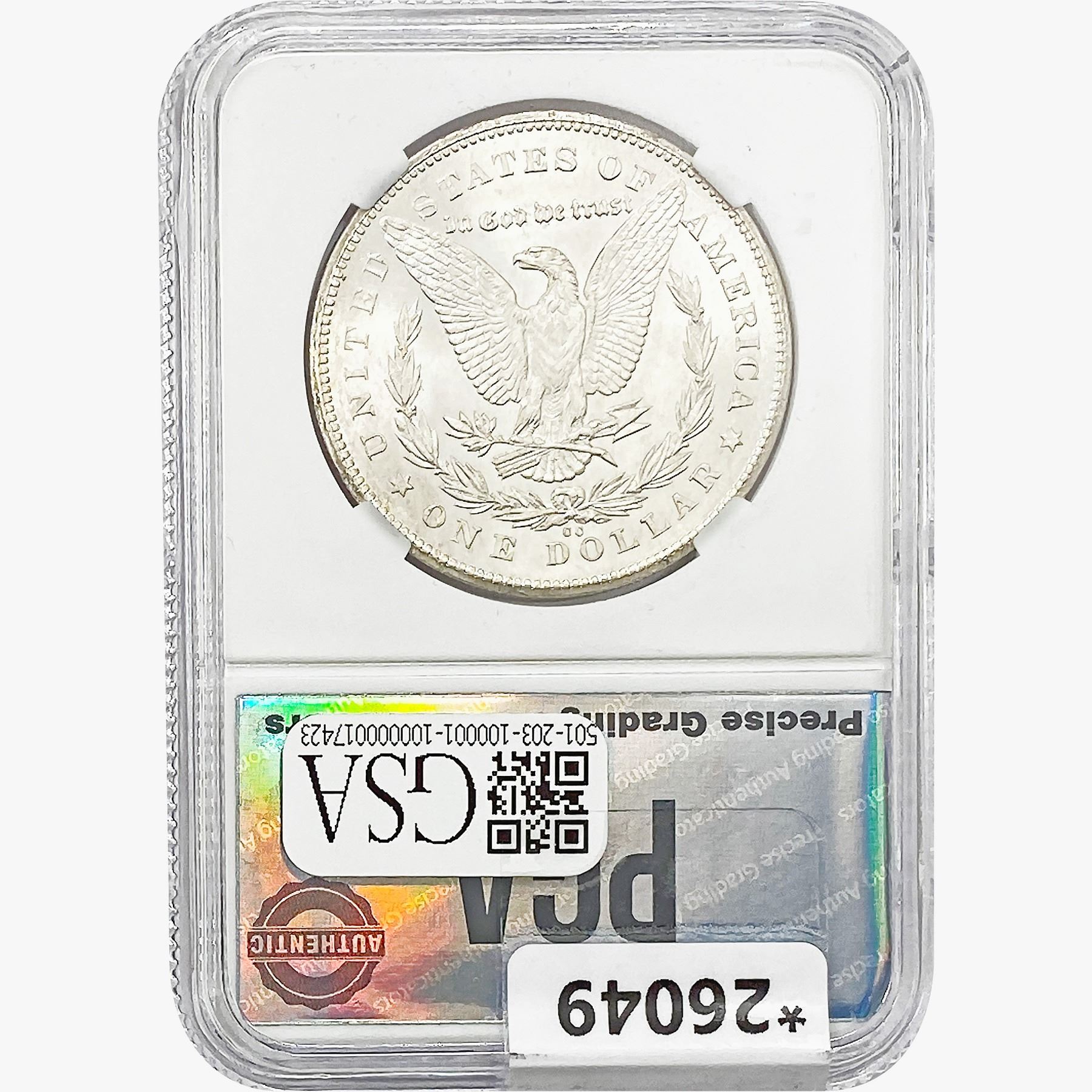 COINS AND CURRENCY LISTED IN GSA’S CATALOG AS GRADED AND ENCAPSULATED BY PCGS, NGC, ANACS, ICG, PCGS CURRENCY, PMG, PCGS BANKNOTE GRADING, CMC OR ANY OTHER THIRD-PARTY GRADING SERVICE ARE LIKEWISE SOLD “AS-IS” EXCEPT AS EXPRESSLY SET FORTH HEREIN. ALL THIRD-PARTY GRADING SERVICE GUARANTEES, INCLUDING AUTHENTICITY, ARE THE SOLE RESPONSIBILITY OF THE THIRD-PARTY GRADING SERVICE AND NOT WARRANTIES OR GUARANTEES OF GSA. BIDDERS SHOULD CONTACT THESE THIRD-PARTY GRADING SERVICES DIRECTLY WITH RESPECT TO ANY CLAIMS OR QUESTIONS THEY MAY HAVE CONCERNING THEIR GUARANTEES AND WARRANTIES. BIDDERS ACKNOWLEDGE AND AGREE THAT AUCTIONEER IS NOT BOUND BY OR LIABLE FOR ANY OPINION OR CERTIFICATION BY ANY THIRD-PARTY GRADING SERVICE. REMOVAL OF A PRODUCT FROM ITS PROTECTIVE CASING OR HOLDER OR ALTERATION OF ANY COIN HOLDER WAIVES ALL RIGHTS CONCERNING THE PRODUCT CONTAINED THEREIN.