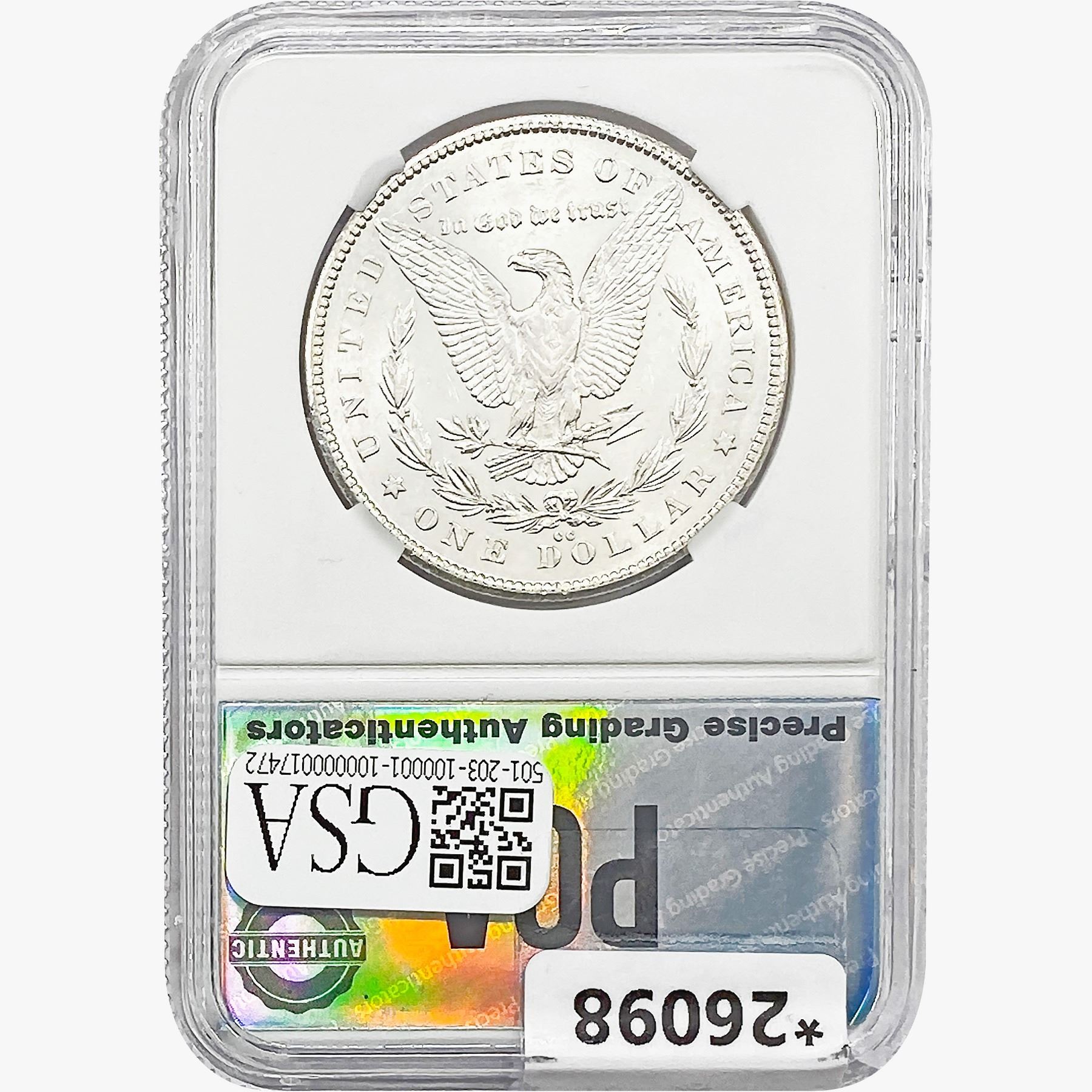 COINS AND CURRENCY LISTED IN GSA’S CATALOG AS GRADED AND ENCAPSULATED BY PCGS, NGC, ANACS, ICG, PCGS CURRENCY, PMG, PCGS BANKNOTE GRADING, CMC OR ANY OTHER THIRD-PARTY GRADING SERVICE ARE LIKEWISE SOLD “AS-IS” EXCEPT AS EXPRESSLY SET FORTH HEREIN. ALL THIRD-PARTY GRADING SERVICE GUARANTEES, INCLUDING AUTHENTICITY, ARE THE SOLE RESPONSIBILITY OF THE THIRD-PARTY GRADING SERVICE AND NOT WARRANTIES OR GUARANTEES OF GSA. BIDDERS SHOULD CONTACT THESE THIRD-PARTY GRADING SERVICES DIRECTLY WITH RESPECT TO ANY CLAIMS OR QUESTIONS THEY MAY HAVE CONCERNING THEIR GUARANTEES AND WARRANTIES. BIDDERS ACKNOWLEDGE AND AGREE THAT AUCTIONEER IS NOT BOUND BY OR LIABLE FOR ANY OPINION OR CERTIFICATION BY ANY THIRD-PARTY GRADING SERVICE. REMOVAL OF A PRODUCT FROM ITS PROTECTIVE CASING OR HOLDER OR ALTERATION OF ANY COIN HOLDER WAIVES ALL RIGHTS CONCERNING THE PRODUCT CONTAINED THEREIN.