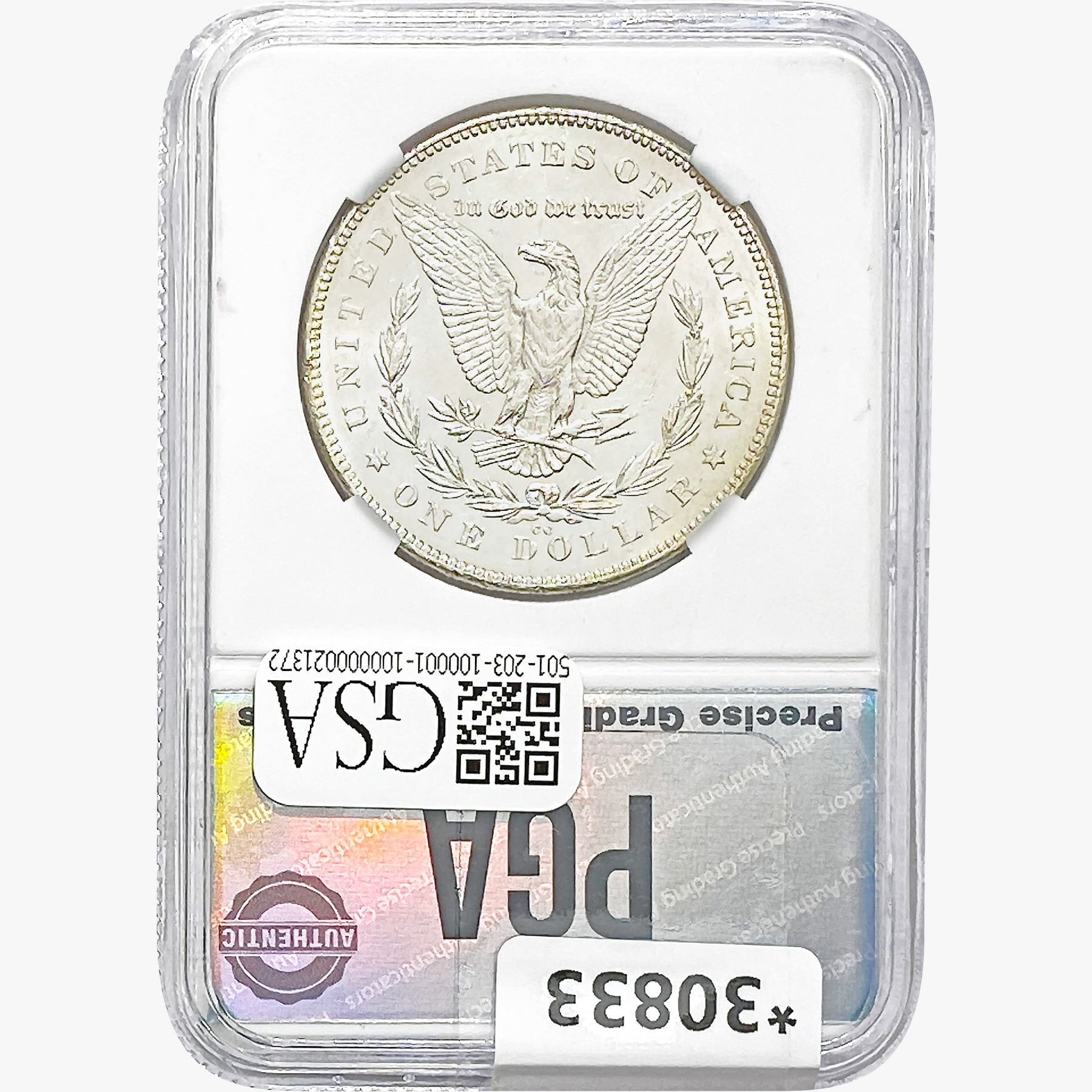 COINS AND CURRENCY LISTED IN GSA’S CATALOG AS GRADED AND ENCAPSULATED BY PCGS, NGC, ANACS, ICG, PCGS CURRENCY, PMG, PCGS BANKNOTE GRADING, CMC OR ANY OTHER THIRD-PARTY GRADING SERVICE ARE LIKEWISE SOLD “AS-IS” EXCEPT AS EXPRESSLY SET FORTH HEREIN. ALL THIRD-PARTY GRADING SERVICE GUARANTEES, INCLUDING AUTHENTICITY, ARE THE SOLE RESPONSIBILITY OF THE THIRD-PARTY GRADING SERVICE AND NOT WARRANTIES OR GUARANTEES OF GSA. BIDDERS SHOULD CONTACT THESE THIRD-PARTY GRADING SERVICES DIRECTLY WITH RESPECT TO ANY CLAIMS OR QUESTIONS THEY MAY HAVE CONCERNING THEIR GUARANTEES AND WARRANTIES. BIDDERS ACKNOWLEDGE AND AGREE THAT AUCTIONEER IS NOT BOUND BY OR LIABLE FOR ANY OPINION OR CERTIFICATION BY ANY THIRD-PARTY GRADING SERVICE. REMOVAL OF A PRODUCT FROM ITS PROTECTIVE CASING OR HOLDER OR ALTERATION OF ANY COIN HOLDER WAIVES ALL RIGHTS CONCERNING THE PRODUCT CONTAINED THEREIN.