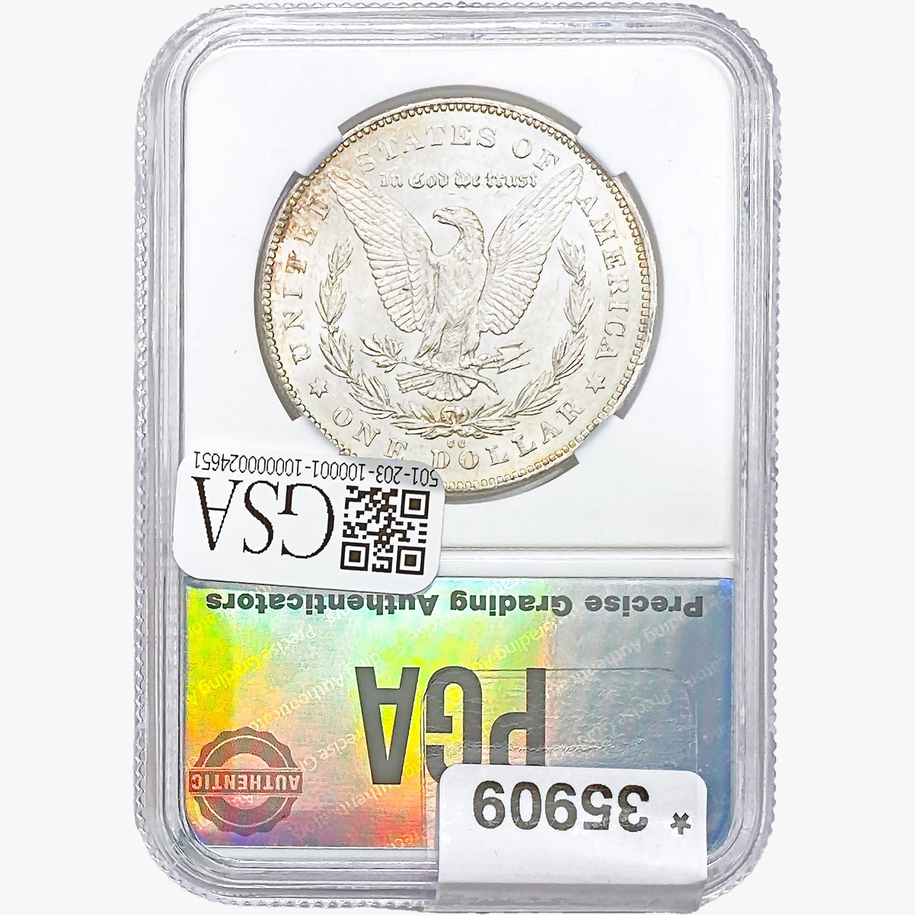 COINS AND CURRENCY LISTED IN GSA’S CATALOG AS GRADED AND ENCAPSULATED BY PCGS, NGC, ANACS, ICG, PCGS CURRENCY, PMG, PCGS BANKNOTE GRADING, CMC OR ANY OTHER THIRD-PARTY GRADING SERVICE ARE LIKEWISE SOLD “AS-IS” EXCEPT AS EXPRESSLY SET FORTH HEREIN. ALL THIRD-PARTY GRADING SERVICE GUARANTEES, INCLUDING AUTHENTICITY, ARE THE SOLE RESPONSIBILITY OF THE THIRD-PARTY GRADING SERVICE AND NOT WARRANTIES OR GUARANTEES OF GSA. BIDDERS SHOULD CONTACT THESE THIRD-PARTY GRADING SERVICES DIRECTLY WITH RESPECT TO ANY CLAIMS OR QUESTIONS THEY MAY HAVE CONCERNING THEIR GUARANTEES AND WARRANTIES. BIDDERS ACKNOWLEDGE AND AGREE THAT AUCTIONEER IS NOT BOUND BY OR LIABLE FOR ANY OPINION OR CERTIFICATION BY ANY THIRD-PARTY GRADING SERVICE. REMOVAL OF A PRODUCT FROM ITS PROTECTIVE CASING OR HOLDER OR ALTERATION OF ANY COIN HOLDER WAIVES ALL RIGHTS CONCERNING THE PRODUCT CONTAINED THEREIN.