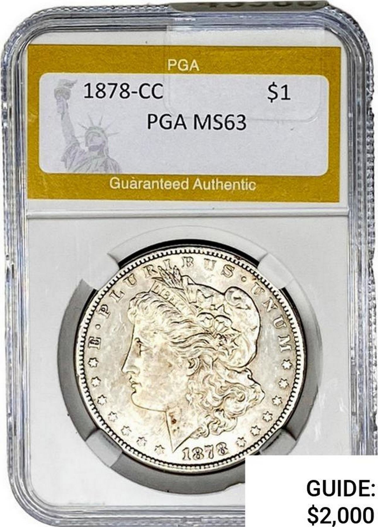 COINS AND CURRENCY LISTED IN GSA’S CATALOG AS GRADED AND ENCAPSULATED BY PCGS, NGC, ANACS, ICG, PCGS CURRENCY, PMG, PCGS BANKNOTE GRADING, CMC OR ANY OTHER THIRD-PARTY GRADING SERVICE ARE LIKEWISE SOLD “AS-IS” EXCEPT AS EXPRESSLY SET FORTH HEREIN. ALL THIRD-PARTY GRADING SERVICE GUARANTEES, INCLUDING AUTHENTICITY, ARE THE SOLE RESPONSIBILITY OF THE THIRD-PARTY GRADING SERVICE AND NOT WARRANTIES OR GUARANTEES OF GSA. BIDDERS SHOULD CONTACT THESE THIRD-PARTY GRADING SERVICES DIRECTLY WITH RESPECT TO ANY CLAIMS OR QUESTIONS THEY MAY HAVE CONCERNING THEIR GUARANTEES AND WARRANTIES. BIDDERS ACKNOWLEDGE AND AGREE THAT AUCTIONEER IS NOT BOUND BY OR LIABLE FOR ANY OPINION OR CERTIFICATION BY ANY THIRD-PARTY GRADING SERVICE. REMOVAL OF A PRODUCT FROM ITS PROTECTIVE CASING OR HOLDER OR ALTERATION OF ANY COIN HOLDER WAIVES ALL RIGHTS CONCERNING THE PRODUCT CONTAINED THEREIN.