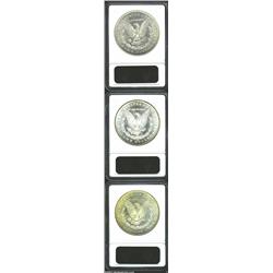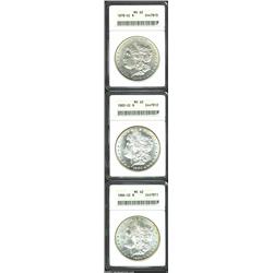 1878-CC S$1 MS62 ANACS, minimally patinated, the surfaces are sharply detailed with a little bit of haziness over the obverse; 1883-CC MS62 ANACS, both sides are sharply detailed, the reverse has the look of a considerably higher grade; and an 1884-CC MS62 ANACS, golden iridescence hugs the obverse border and overlays the left reverse.From the Hans Poetsch Collection. 3 coins Important notice: We expect to be auctioning lots at the rate of 200-250 per hour. Sometimes eBay Premier live bid software cannot keep up with that pace, so we strongly recommend that you place a realistic proxy bid now as insurance to avoid disappointment. Also please note that all Heritage/CAA lots purchased through eBay Premier carry a 20% Buyer's Premium. Please make sure you read the Terms and Conditions.