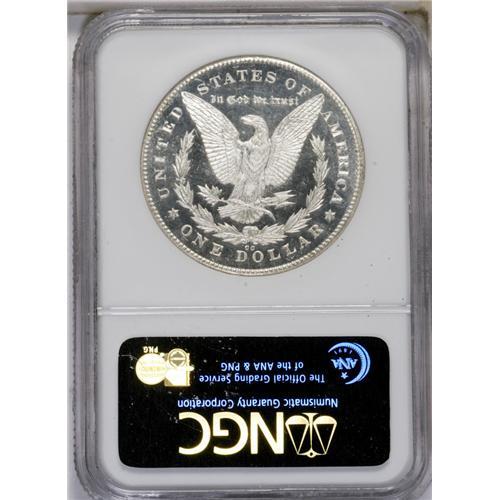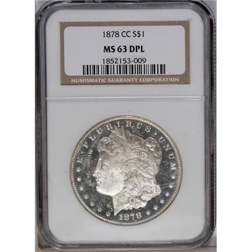 <B>1878-CC<img border='0' src='http://www.heritagecoins.com/images/star.gif' width=10 height=10>$1> MS63 Deep Mirror Prooflike NGC.</B></I> VAM-11. A Top 100 Variety. Impressive frost throughout the devices provides obvious contrast with the prominently reflective fields. The reverse is well preserved, while the obverse has light grazes on the field and cheek.