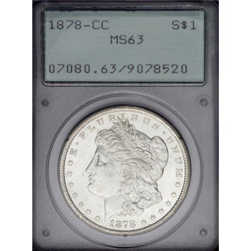 <B>1878-CC<img border='0' src='http://www.heritagecoins.com/images/star.gif' width=10 height=10>$1> MS63 PCGS.</B></I> Lustrous and intricately struck, this brilliant and booming first year Morgan dollar has a splendid reverse and no shortage of eye appeal. <BR><BR><B>Important notice:</B> Heritage usually auctions material at the rate of 200-250 lots per hour. On some occasions eBay Live bid software or the Internet may not be able to keep up with the pace of the auction. We recommend placing a realistic absentee bid now as insurance to avoid disappointment. Occasionally the auctioneer may eliminate or reject an eBay Live bid, and the auctioneer may also reopen a lot after the close of the eBay live bidding (usually because we missed an audience bid), and may reject your bid even if it shows you as the winning bidder. By bidding via eBay Live, you agree that Heritage may award the lot to another bidder at its sole discretion under the circumstances described above or any other reasonable circumstances. Since eBay bids are not shown to us until we open the lot on the floor, we treat those bids just like floor bids. In most cases the floor responds before the eBay bid is presented to us, due to Internet lag time, so for consistency we have made it a policy that floor bids are always considered first over tie eBay live bids. Also please note that all Heritage lots purchased through eBay Live carry a 20% Buyer's Premium. Please make sure you read the Terms and Conditions before you bid. This lot is being auctioned in conjunction with a live floor auction by Heritage Galleries & Auctioneers. All final auction and invoice information will be supplied by Heritage Galleries & Auctioneers, and all other information should be considered preliminary. Lot:3201 <BR><BR><B>Winning Notification and Billing:</B> After the FINAL session in this auction is complete, Heritage will send e-mail and snail mail invoices. This process normally takes several days. All final auction and invoice information will be supplied by Heritage Galleries & Auctioneers, and all other information should be considered preliminary. <BR><BR>This auction will be conducted on a live auction floor and over the Internet through eBay Live. If you choose to place an absentee bid, please take a moment to <font color='#0000ff'><u><a href='http://pages.ebay.com/liveauctions/help/before/laabsentee.html'>learn how eBay Live absentee bidding works</a></u></font><font color='#000000'>