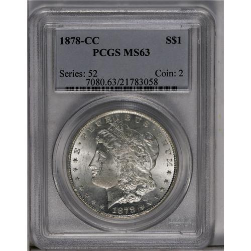 <B>1878-CC<img border='0' src='http://www.heritagecoins.com/images/star.gif' width=10 height=10>$1> MS63 PCGS.</B></I> Sharply struck with bright, frosty luster, a slight degree of cloudiness in the fields, and a few grade-limiting nicks and small abrasions. As the first Carson City Morgan dollar, the '78-CC is an immensely popular issue.