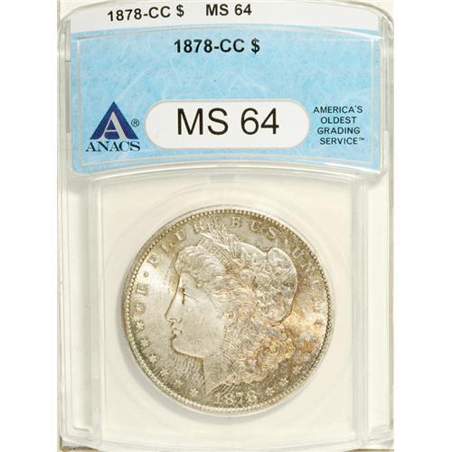 <B>1878-CC S$1 MS64 ANACS.</B></I> Highly lustrous and nicely struck with lovely orange and red patina over the right side of the obverse and at the reverse periphery. Scattered marks and a fingerprint below Liberty's chin account for the grade.<BR><BR><b>Shipping:</b> Coin/Currency (<a target="_blank" href="http://www.heritageauctions.com/common/shipping.php">view shipping information</a>)