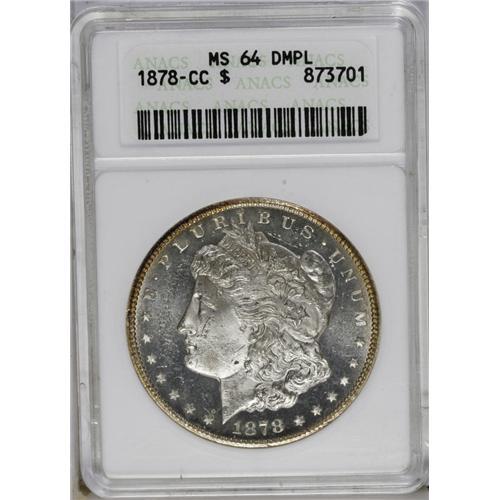<B>1878-CC<img border='0' src='http://www.heritagecoins.com/images/star.gif' width=10 height=10>$1> MS64 Deep Mirror Prooflike ANACS.</B></I> VAM-11. A Top 100 Variety. This flashy near-Gem is sharply struck aside from the claws, and is brilliant save for light rose-gold peripheral toning and the occasional small fleck.