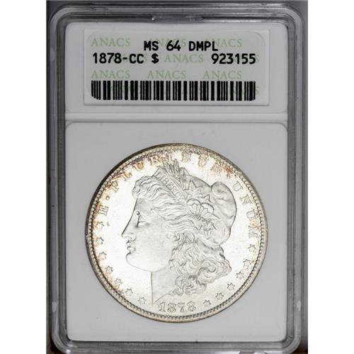 <B>1878-CC<img border='0' src='http://www.heritagecoins.com/images/star.gif' width=10 height=10>$1> MS64 Deep Mirror Prooflike ANACS.</B></I> Whispers of gold and sky-blue patina gravitate to the peripheries of this wonderful '78-C dollar. The design elements are sharply impressed, including virtually full definition in the hair over Liberty's ear and on the eagle's breast. A few minor marks on Liberty's cheek and forehead define the grade. <BR><BR><B>Important notice:</B> Heritage usually auctions material at the rate of 200-250 lots per hour. On some occasions eBay Live bid software or the Internet may not be able to keep up with the pace of the auction. We recommend placing a realistic absentee bid now as insurance to avoid disappointment. Occasionally the auctioneer may eliminate or reject an eBay Live bid, and the auctioneer may also reopen a lot after the close of the eBay live bidding (usually because we missed an audience bid), and may reject your bid even if it shows you as the winning bidder. By bidding via eBay Live, you agree that Heritage may award the lot to another bidder at its sole discretion under the circumstances described above or any other reasonable circumstances. Since eBay bids are not shown to us until we open the lot on the floor, we treat those bids just like floor bids. In most cases the floor responds before the eBay bid is presented to us, due to Internet lag time, so for consistency we have made it a policy that floor bids are always considered first over tie eBay live bids. Also please note that all Heritage lots purchased through eBay Live carry a 20% Buyer's Premium. Please make sure you read the Terms and Conditions before you bid. This lot is being auctioned in conjunction with a live floor auction by Heritage Galleries & Auctioneers. All final auction and invoice information will be supplied by Heritage Galleries & Auctioneers, and all other information should be considered preliminary. Lot:3221 <BR><BR><B>Winning Notification and Billing:</B> After the FINAL session in this auction is complete, Heritage will send e-mail and snail mail invoices. This process normally takes several days. All final auction and invoice information will be supplied by Heritage Galleries & Auctioneers, and all other information should be considered preliminary. <BR><BR>This auction will be conducted on a live auction floor and over the Internet through eBay Live. If you choose to place an absentee bid, please take a moment to <font color='#0000ff'><u><a href='http://pages.ebay.com/liveauctions/help/before/laabsentee.html'>learn how eBay Live absentee bidding works</a></u></font><font color='#000000'>