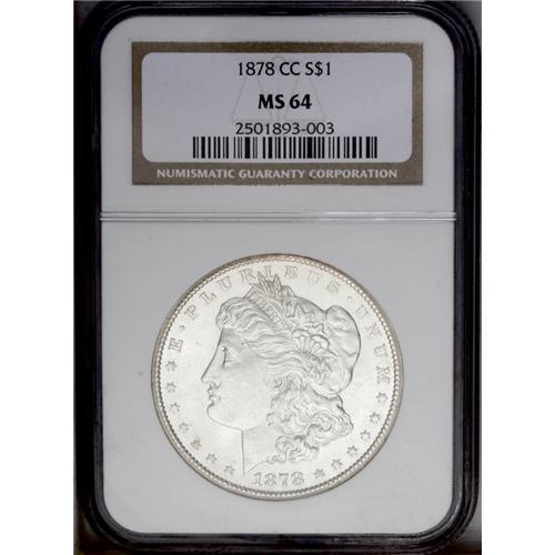 <B>1878-CC<img border='0' src='http://www.heritagecoins.com/images/star.gif' width=10 height=10>$1> MS64 NGC.</B></I> Exquisite striking definition is apparent on this Carson City dollar, including in the hair over Liberty's ear. Lustrous silver-gray surfaces display just a touch of light tan on the Liberty and eagle motifs. A few luster grazes and minute contact marks on the cheek and neck prevent an even higher grade. Light roller marks are noted in the upper right obverse. <BR><BR><B>Important notice:</B> Heritage usually auctions material at the rate of 200-250 lots per hour. On some occasions eBay Live bid software or the Internet may not be able to keep up with the pace of the auction. We recommend placing a realistic absentee bid now as insurance to avoid disappointment. Occasionally the auctioneer may eliminate or reject an eBay Live bid, and the auctioneer may also reopen a lot after the close of the eBay live bidding (usually because we missed an audience bid), and may reject your bid even if it shows you as the winning bidder. By bidding via eBay Live, you agree that Heritage may award the lot to another bidder at its sole discretion under the circumstances described above or any other reasonable circumstances. Since eBay bids are not shown to us until we open the lot on the floor, we treat those bids just like floor bids. In most cases the floor responds before the eBay bid is presented to us, due to Internet lag time, so for consistency we have made it a policy that floor bids are always considered first over tie eBay live bids. Also please note that all Heritage lots purchased through eBay Live carry a 20% Buyer's Premium. Please make sure you read the Terms and Conditions before you bid. This lot is being auctioned in conjunction with a live floor auction by Heritage Galleries & Auctioneers. All final auction and invoice information will be supplied by Heritage Galleries & Auctioneers, and all other information should be considered preliminary. Lot:3204 <BR><BR><B>Winning Notification and Billing:</B> After the FINAL session in this auction is complete, Heritage will send e-mail and snail mail invoices. This process normally takes several days. All final auction and invoice information will be supplied by Heritage Galleries & Auctioneers, and all other information should be considered preliminary. <BR><BR>This auction will be conducted on a live auction floor and over the Internet through eBay Live. If you choose to place an absentee bid, please take a moment to <font color='#0000ff'><u><a href='http://pages.ebay.com/liveauctions/help/before/laabsentee.html'>learn how eBay Live absentee bidding works</a></u></font><font color='#000000'>