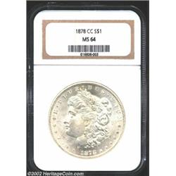 1878-CC S$1 MS64 NGC. Light gold patina. A lustrous near-Gem with a gorgeously preserved reverse. Well struck in the centers, but with a hint of weakness of strike on the claws and lowest leaves. Important notice: We expect to be auctioning lots at the rate of 200-250 per hour. Sometimes eBay Premier live bid software cannot keep up with that pace, so we strongly recommend that you place a realistic proxy bid now as insurance to avoid disappointment. Also please note that all Heritage/CAA lots purchased through eBay Premier carry a 20% Buyer's Premium. Please make sure you read the Terms and Conditions.