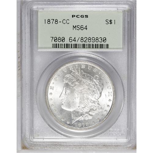 <B>1878-CC<img border='0' src='http://www.heritagecoins.com/images/star.gif' width=10 height=10>$1> MS64 PCGS.</B></I> A boldly struck piece with appealing luster. Pale golden-brown toning appears in the left obverse field, and minor abrasions appear on the surfaces of this otherwise untoned coin.