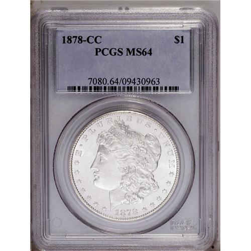 <B>1878-CC<img border='0' src='http://www.heritagecoins.com/images/star.gif' width=10 height=10>$1> MS64 PCGS.</B></I> Brilliant throughout with strong mint luster, there are a few small abrasions and luster grazes on the obverse that limit the grade of this piece to MS64. <BR><BR><B>Important notice:</B> Heritage usually auctions material at the rate of 200-250 lots per hour. On some occasions eBay Live bid software or the Internet may not be able to keep up with the pace of the auction. We recommend placing a realistic absentee bid now as insurance to avoid disappointment. Occasionally the auctioneer may eliminate or reject an eBay Live bid, and the auctioneer may also reopen a lot after the close of the eBay live bidding (usually because we missed an audience bid), and may reject your bid even if it shows you as the winning bidder. By bidding via eBay Live, you agree that Heritage may award the lot to another bidder at its sole discretion under the circumstances described above or any other reasonable circumstances. Since eBay bids are not shown to us until we open the lot on the floor, we treat those bids just like floor bids. In most cases the floor responds before the eBay bid is presented to us, due to Internet lag time, so for consistency we have made it a policy that floor bids are always considered first over tie eBay live bids. Also please note that all Heritage lots purchased through eBay Live carry a 20% Buyer's Premium. Please make sure you read the Terms and Conditions before you bid. This lot is being auctioned in conjunction with a live floor auction by Heritage Galleries & Auctioneers. All final auction and invoice information will be supplied by Heritage Galleries & Auctioneers, and all other information should be considered preliminary. Lot:3202 <BR><BR><B>Winning Notification and Billing:</B> After the FINAL session in this auction is complete, Heritage will send e-mail and snail mail invoices. This process normally takes several days. All final auction and invoice information will be supplied by Heritage Galleries & Auctioneers, and all other information should be considered preliminary. <BR><BR>This auction will be conducted on a live auction floor and over the Internet through eBay Live. If you choose to place an absentee bid, please take a moment to <font color='#0000ff'><u><a href='http://pages.ebay.com/liveauctions/help/before/laabsentee.html'>learn how eBay Live absentee bidding works</a></u></font><font color='#000000'>