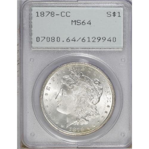 <B>1878-CC<img border='0' src='http://www.heritagecoins.com/images/star.gif' width=10 height=10>$1> MS64 PCGS.</B></I> Gold patina visits the date, but this lustrous and exactingly struck near-Gem is otherwise brilliant. A concealed mark on the cap will be missed by most. In a first generation holder.