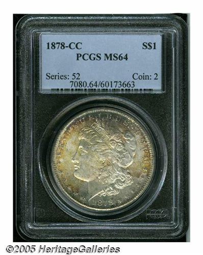 <B>1878-CC<S$1> MS64 PCGS.</B></I> Highly lustrous with frosty silver surfaces beneath radiant gold and iridescent toning. Exceptionally attractive and desirable.