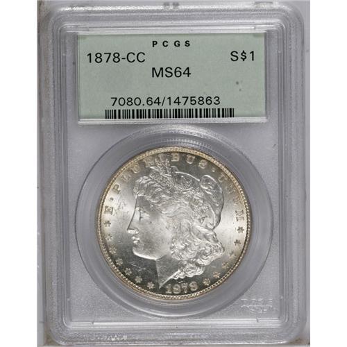 <B>1878-CC<img border='0' src='http://www.heritagecoins.com/images/star.gif' width=10 height=10>$1> MS64 PCGS.</B></I> Hints of golden-brown iridescence endow the margins. Potent cartwheel luster illuminates this carefully preserved near-Gem. Well struck, even on the claws and the hair above the ear. Encapsulated in a green label holder.