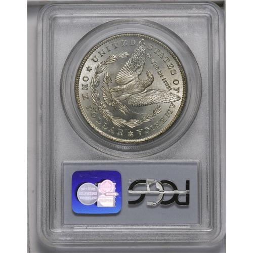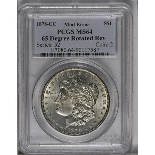 <B>1878-CC<img border='0' src='http://www.heritagecoins.com/images/star.gif' width=10 height=10>$1> MS64 PCGS.</B></I> The reverse is rotated 65 degrees clockwise. A triangle of milky patina to the left of Liberty's neck is the only toning on this otherwise bright and lustrous Carson City dollar. The strike is solid throughout.