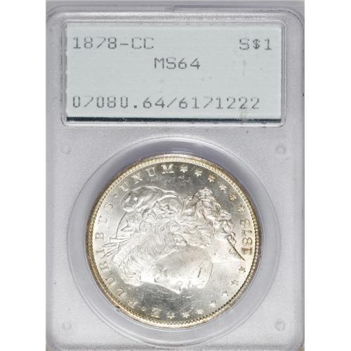 <B>1878-CC<img border='0' src='http://www.heritagecoins.com/images/star.gif' width=10 height=10>$1> MS64 PCGS.</B></I> This ever-popular issue is here represented by a mostly brilliant example with a touch of light gold at the rims on each side, with some field-device contrast. Attractive, and in a first-generation holder.