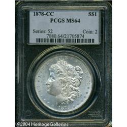 1878-CC S$1 MS64 PCGS. Well struck, with white, lu <B>1878-CC S$1 MS64 PCGS.</B></I> Well struck, with white, lustrous surfaces that exhibit a few minute marks on Liberty's cheek. <BR><BR><B>Important notice:</B> Heritage usually auctions material at the rate of 200-250 lots per hour. On some occasions eBay Live bid software or the Internet may not be able to keep up with the pace of the auction. We recommend placing a realistic absentee bid now as insurance to avoid disappointment. Occasionally the auctioneer may eliminate or reject an eBay Live bid, and the auctioneer may also reopen a lot after the close of the eBay live bidding (usually because we missed an audience bid), and may reject your bid even if it shows you as the winning bidder. By bidding via eBay Live, you agree that Heritage may award the lot to another bidder at its sole discretion under the circumstances described above or any other reasonable circumstances. Since eBay bids are not shown to us until we open the lot on the floor, we treat those bids just like floor bids. In most cases the floor responds before the eBay bid is presented to us, due to Internet lag time, so for consistency we have made it a policy that floor bids are always considered first over tie eBay live bids. Also please note that all Heritage lots purchased through eBay Live carry a 20% Buyer's Premium. Please make sure you read the Terms and Conditions before you bid. This lot is being auctioned in conjunction with a live floor auction by Heritage Galleries & Auctioneers. All final auction and invoice information will be supplied by Heritage Galleries & Auctioneers, and all other information should be considered preliminary. Lot:7301