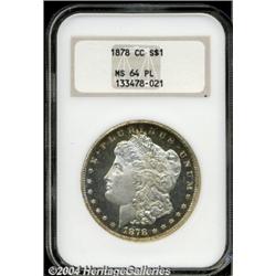 <B>1878-CC<S$1> MS64 Prooflike NGC.</B></I> Chalky-white design elements and glassy fields are nicely framed in golden-russet toning. Relatively few 1878-CC Dollars possess this much eye appeal. <BR><BR><B>Important notice:</B> Heritage usually auctions material at the rate of 200-250 lots per hour. On some occasions eBay Live bid software or the Internet may not be able to keep up with the pace of the auction. We recommend placing a realistic absentee bid now as insurance to avoid disappointment. Occasionally the auctioneer may eliminate or reject an eBay Live bid, and the auctioneer may also reopen a lot after the close of the eBay live bidding (usually because we missed an audience bid), and may reject your bid even if it shows you as the winning bidder. By bidding via eBay Live, you agree that Heritage may award the lot to another bidder at its sole discretion under the circumstances described above or any other reasonable circumstances. Since eBay bids are not shown to us until we open the lot on the floor, we treat those bids just like floor bids. In most cases the floor responds before the eBay bid is presented to us, due to Internet lag time, so for consistency we have made it a policy that floor bids are always considered first over tie eBay live bids. Also please note that all Heritage lots purchased through eBay Live carry a 20% Buyer's Premium. Please make sure you read the Terms and Conditions before you bid.