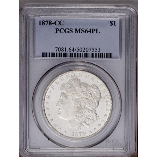 <B>1878-CC<img border='0' src='http://www.heritagecoins.com/images/star.gif' width=10 height=10>$1> MS64 Prooflike PCGS.</B></I> Supremely frosty with dynamically reflective fields, this near-Gem is well struck and carefully preserved. Wispy marks prevent the Gem grade assessment, but this remains a visually fetching prooflike representative from the first year of Morgan dollar production. <BR><BR><B>Important notice:</B> Heritage usually auctions material at the rate of 200-250 lots per hour. On some occasions eBay Live bid software or the Internet may not be able to keep up with the pace of the auction. We recommend placing a realistic absentee bid now as insurance to avoid disappointment. Occasionally the auctioneer may eliminate or reject an eBay Live bid, and the auctioneer may also reopen a lot after the close of the eBay live bidding (usually because we missed an audience bid), and may reject your bid even if it shows you as the winning bidder. By bidding via eBay Live, you agree that Heritage may award the lot to another bidder at its sole discretion under the circumstances described above or any other reasonable circumstances. Since eBay bids are not shown to us until we open the lot on the floor, we treat those bids just like floor bids. In most cases the floor responds before the eBay bid is presented to us, due to Internet lag time, so for consistency we have made it a policy that floor bids are always considered first over tie eBay live bids. Also please note that all Heritage lots purchased through eBay Live carry a 20% Buyer's Premium. Please make sure you read the Terms and Conditions before you bid. This lot is being auctioned in conjunction with a live floor auction by Heritage Galleries & Auctioneers. All final auction and invoice information will be supplied by Heritage Galleries & Auctioneers, and all other information should be considered preliminary. Lot:3219 <BR><BR><B>Winning Notification and Billing:</B> After the FINAL session in this auction is complete, Heritage will send e-mail and snail mail invoices. This process normally takes several days. All final auction and invoice information will be supplied by Heritage Galleries & Auctioneers, and all other information should be considered preliminary. <BR><BR>This auction will be conducted on a live auction floor and over the Internet through eBay Live. If you choose to place an absentee bid, please take a moment to <font color='#0000ff'><u><a href='http://pages.ebay.com/liveauctions/help/before/laabsentee.html'>learn how eBay Live absentee bidding works</a></u></font><font color='#000000'>