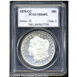 <B>1878-CC<S$1> MS64 Prooflike PCGS.</B></I> A cameo-like effect is evident on this well struck, virtually blemish-free example. <BR><BR><B>Important notice:</B> Heritage usually auctions material at the rate of 200-250 lots per hour. On some occasions eBay Live bid software or the Internet may not be able to keep up with the pace of the auction. We recommend placing a realistic absentee bid now as insurance to avoid disappointment. Occasionally the auctioneer may eliminate or reject an eBay Live bid, and the auctioneer may also reopen a lot after the close of the eBay live bidding (usually because we missed an audience bid), and may reject your bid even if it shows you as the winning bidder. By bidding via eBay Live, you agree that Heritage may award the lot to another bidder at its sole discretion under the circumstances described above or any other reasonable circumstances. Since eBay bids are not shown to us until we open the lot on the floor, we treat those bids just like floor bids. In most cases the floor responds before the eBay bid is presented to us, due to Internet lag time, so for consistency we have made it a policy that floor bids are always considered first over tie eBay live bids. Also please note that all Heritage lots purchased through eBay Live carry a 20% Buyer's Premium. Please make sure you read the Terms and Conditions before you bid.