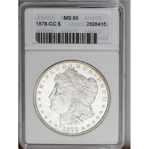 <B>1878-CC<img border='0' src='http://www.heritagecoins.com/images/star.gif' width=10 height=10>$1> MS65 ANACS.</B></I> Bright and flashy, with semi-prooflike reflectivity in the glassy fields and an essentially brilliant appearance. Very few surface marks are evident on either side of the piece. The percentage of Gem quality '78-CC dollars is lower than that of the other more common Carson City issues from the 1880s.